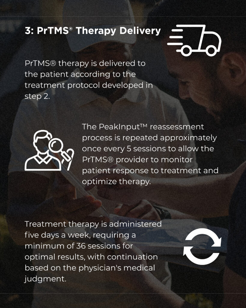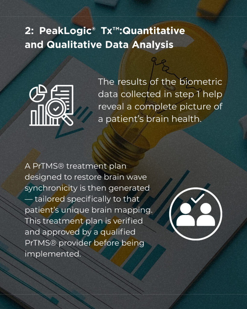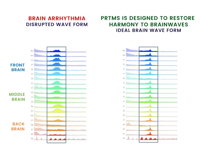 Unlike conventional TMS, which is one-size-fits-all, PrTMS® utilizes a proprietary protocol to develop personalized treatment plans. These plans are based on a patient’s unique brain electrical patterns and are designed to restore harmony to brainwave activity. Each plan is verified and approved by a qualified PrTMS® provider before implementation.